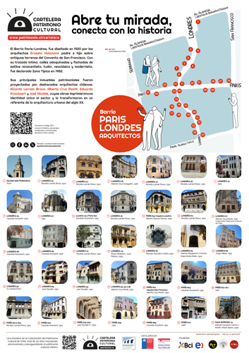 Knockaert diseñó viviendas como Londres 49, Londres 54 y París 840, en las que incluyó novedosos atisbos de modernismo. A Larraín Bravo se le debe la construcción de las casas de Londres 25, 27, 37, 38, 61-63, integrando mosaicos, rejas de fierro forjado y elementos ornamentales, otorgando estética e identidad al trazado del barrio. Por su parte, Cruz Montt dejó su huella en inmuebles como el de la Sociedad Chilena de Historia y Geografía mismo edificio en el que se encuentra la sede de nuestra corporación.