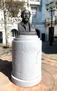 Finalmente, en la plazoleta central del barrio Paris Londres, se instaló en 2002 un busto en homenaje al historiador y bibliógrafo José Toribio Medina, figura clave en la preservación del patrimonio documental chileno. El busto es una reproducción del original realizado por el escultor catalán Antonio Coll i Pi, que se encuentra hoy en la Biblioteca Nacional de Chile. Esta institución resguarda además la extraordinaria colección que Medina donó al país, conservada en uno de los espacios más emblemáticos del edificio: la Sala Medina.
