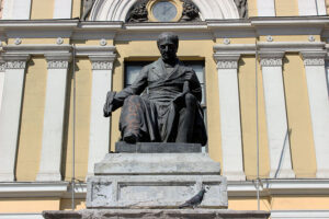 Nicanor Plaza también es autor del monumento dedicado al intelectual venezolano Andrés Bello, primer rector de la universidad y redactor del Código Civil. Esculpida en mármol en 1881, la obra fue trasladada varias veces dentro de la ciudad hasta instalarse frente al edificio universitario en 1931. Casi cuarenta años más tarde, en 1974, se decidió encargar al escultor Samuel Román una copia en bronce que pudiera permanecer a la intemperie, mientras el original fue trasladado al patio central, donde se conserva hasta hoy. Ese mismo año, el edificio fue declarado Monumento Histórico.
