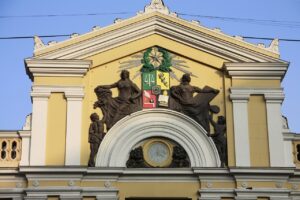 Sobre el acceso principal de la Casa Central de la Universidad de Chile, se distingue reloj encargado en 1929 a la casa Clemens Riefler de Münich. Tiene una inscripción: “Hora del Observatorio Astronómico Nacional” y recuerda el periodo en que el reloj del palacio universitario y el del observatorio estaban sincronizados, para marcar la hora exacta de los santiaguinos. Complementa la fachada un valioso conjunto escultórico que representa las ciencias y las artes rodeando el escudo de la universidad, realizado en 1878 por el escultor chileno Nicanor Plaza.